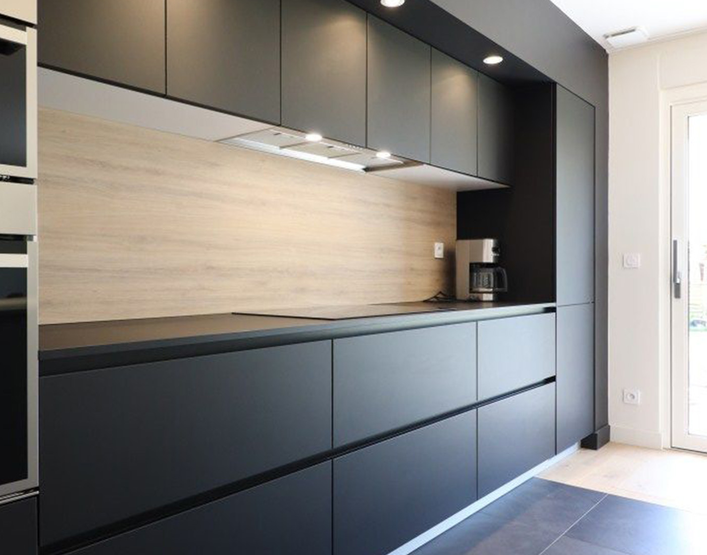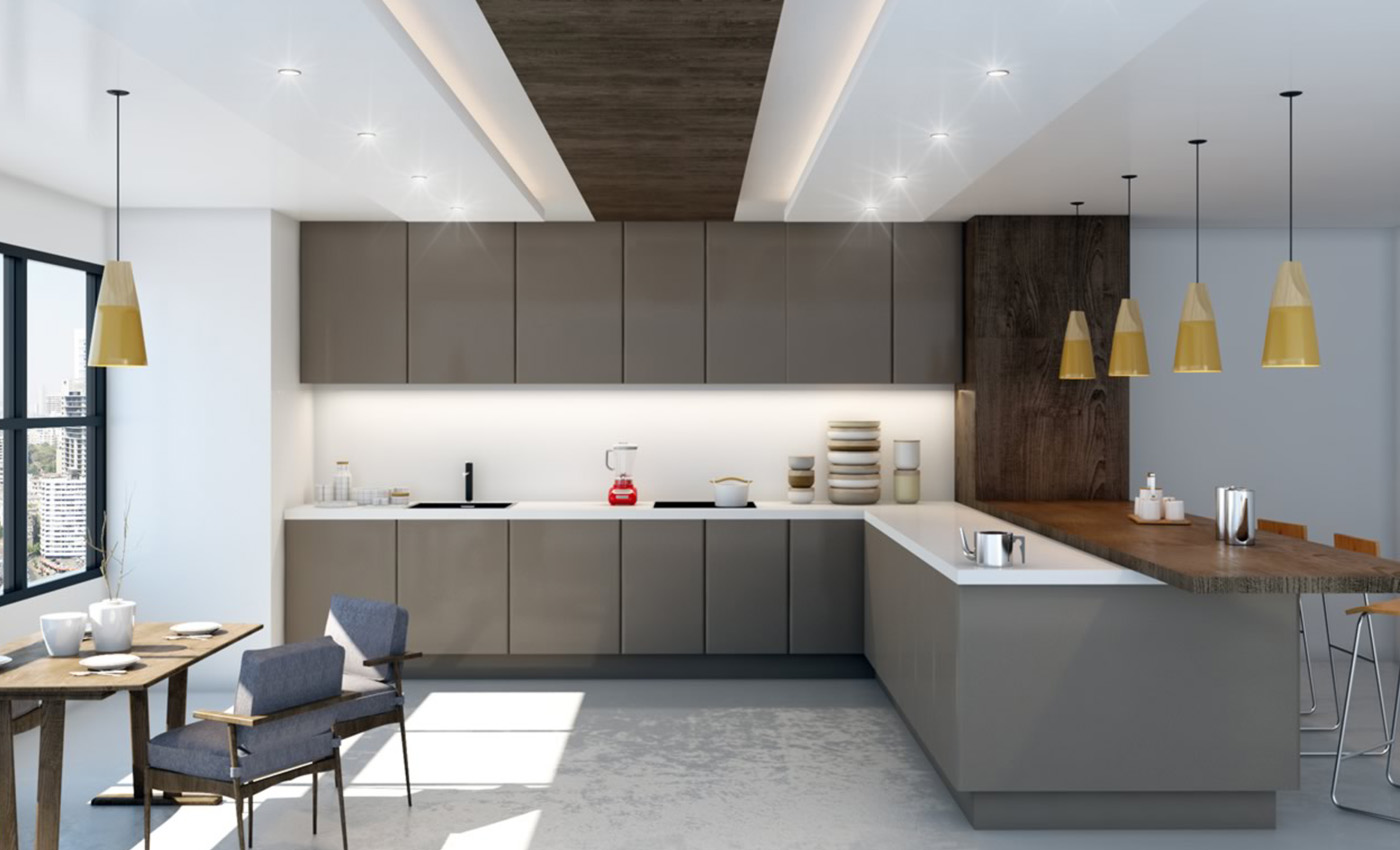 Kitchen specially made by Green Lam AFX Laminate, which has been specially treated to make the surface impression free non porous. Scratch resistant and hydro repellent, making it effortless to clean away impurities.